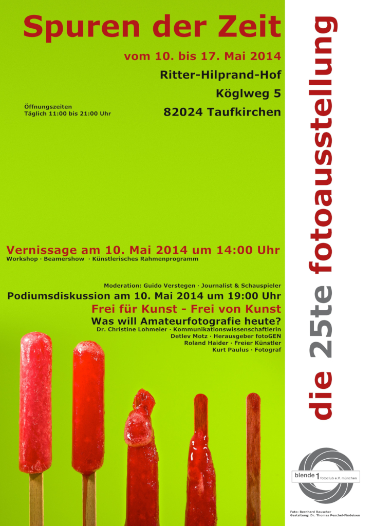 Der Blende 1 Fotoclub e.V. München präsentiert in diesem Jahr seine 25te Jahresausstellung. „Spuren der Zeit“, lautet das Motto der Ausstellung 2014, die vom 10. Bis 14. Mai im Ritter-Hilprand-Hof in 82024 Taufkirchen zu sehen ist.